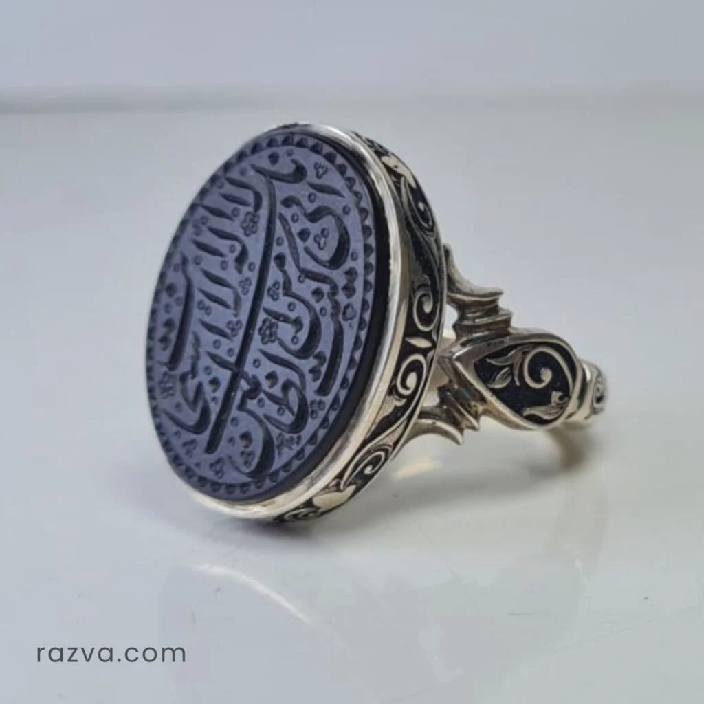 خاتم عقيق أسود يماني رجالي فضة بنقش قرآني ومونتير فنية فاخرة