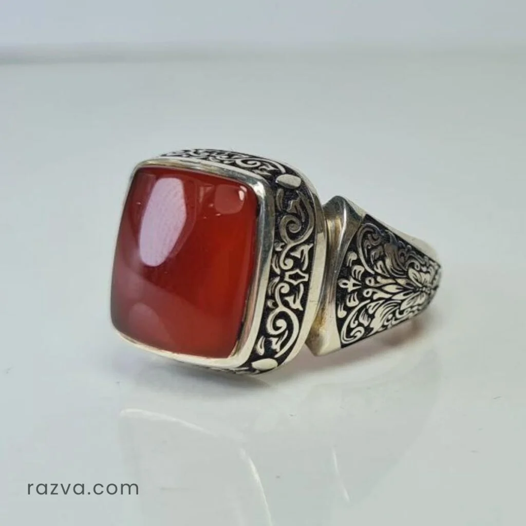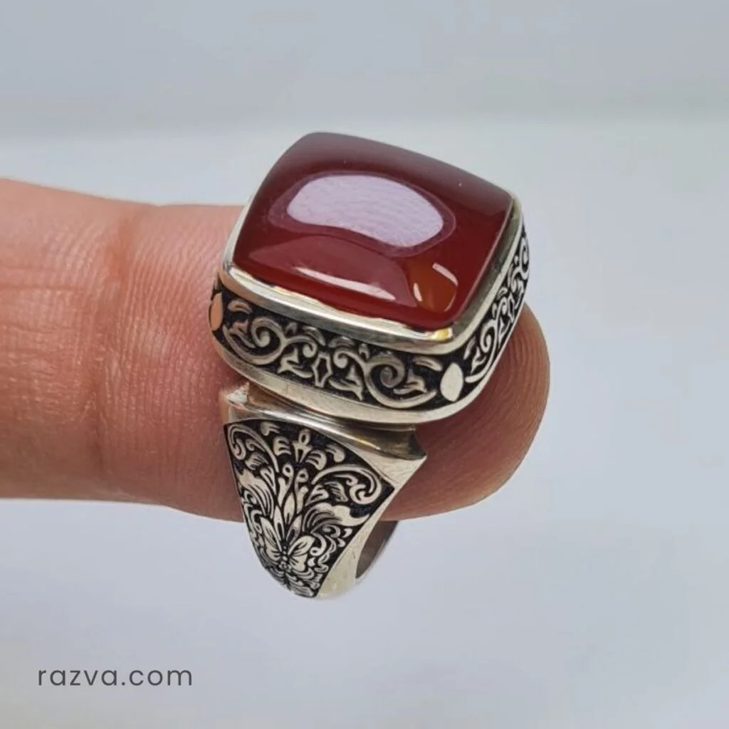 تتميّز جوانب الخاتم بزخارف نباتية إسلامية محفورة بدقة، مع توازن مثالي بين سماكة الفضة وبروز الحجر، ما يجعله خيارًا مميزًا لمن يبحث عن خاتم عقيق رجالي فاخر للاقتناء أو للإهداء في المناسبات الخاصة.