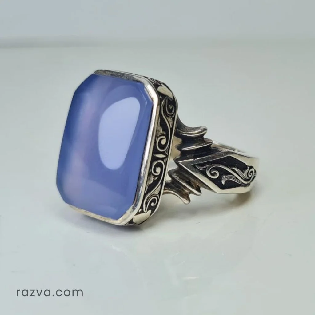 خاتم عقيق بنفسجي يماني رجالي فضة ٩٢٥ بتصميم مستطيل وزخارف شرقية