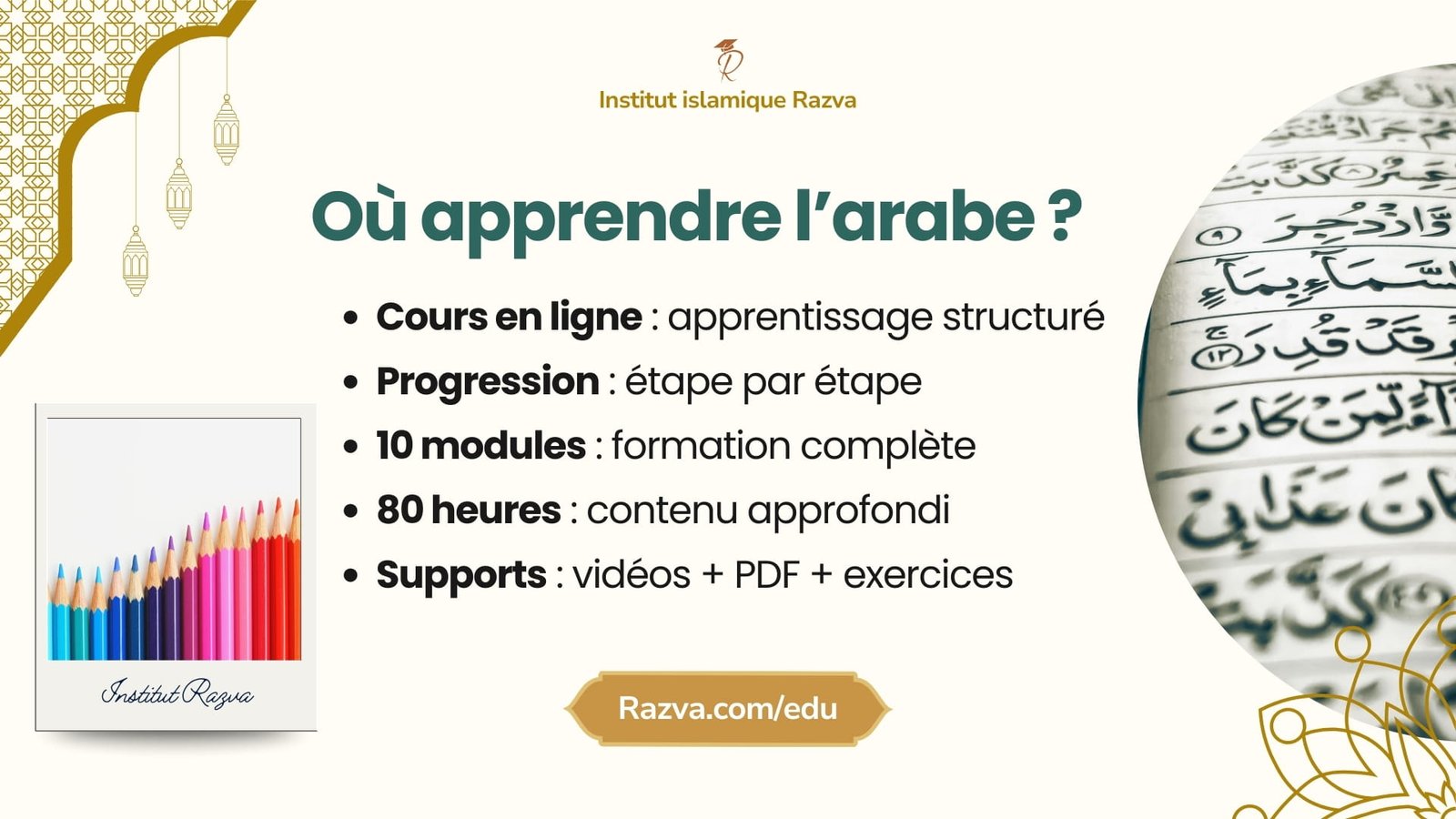 À la fin de cette lecture, vous disposerez d’un vocabulaire solide et structuré, accompagné d’un PDF récapitulatif pour faciliter la mémorisation. Cet apprentissage s’inscrit dans une approche globale proposée par notre institut des sciences islamiques en ligne Razva, qui vous accompagne pas à pas pour apprendre l’arabe de manière sérieuse et efficace.