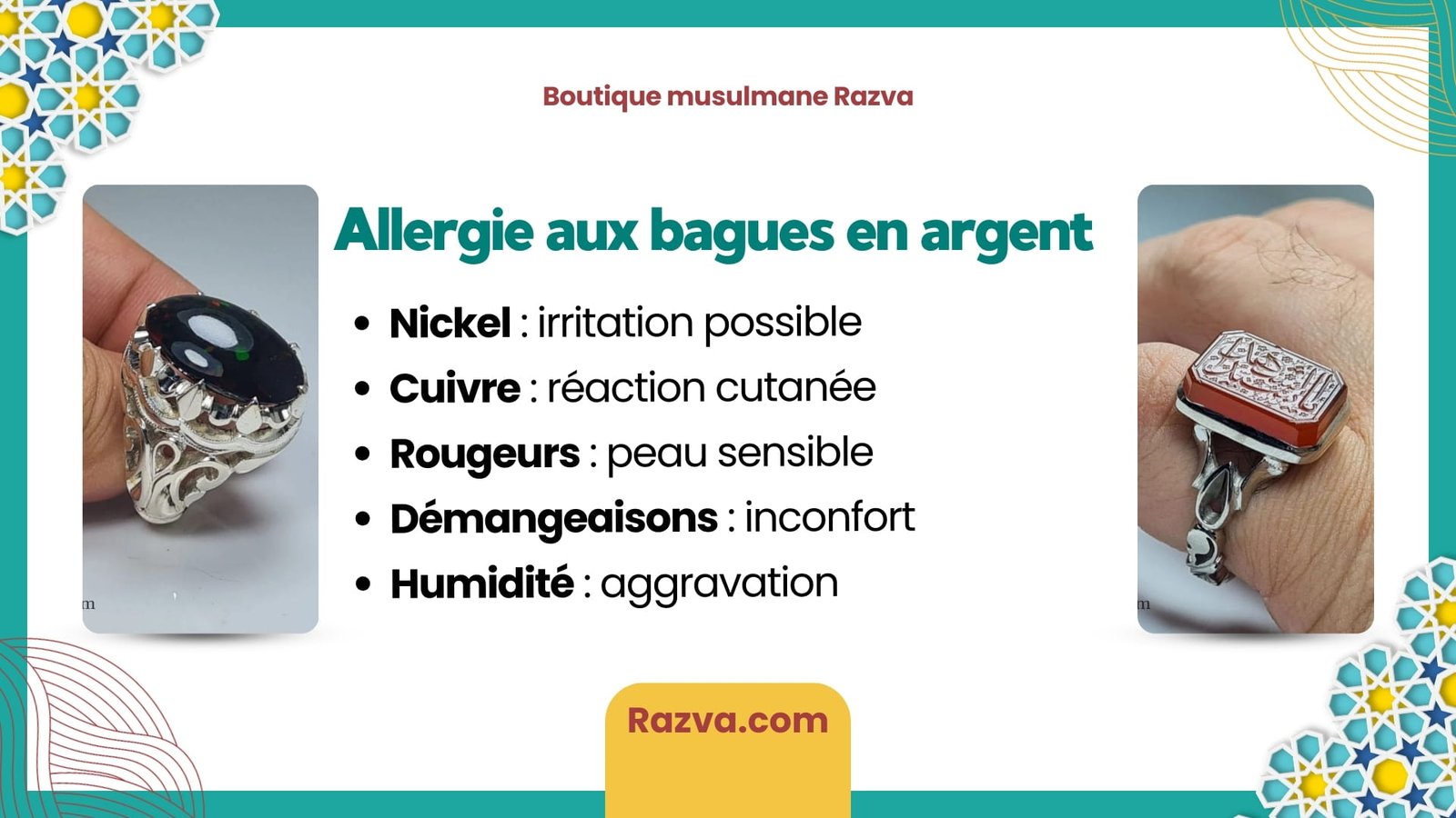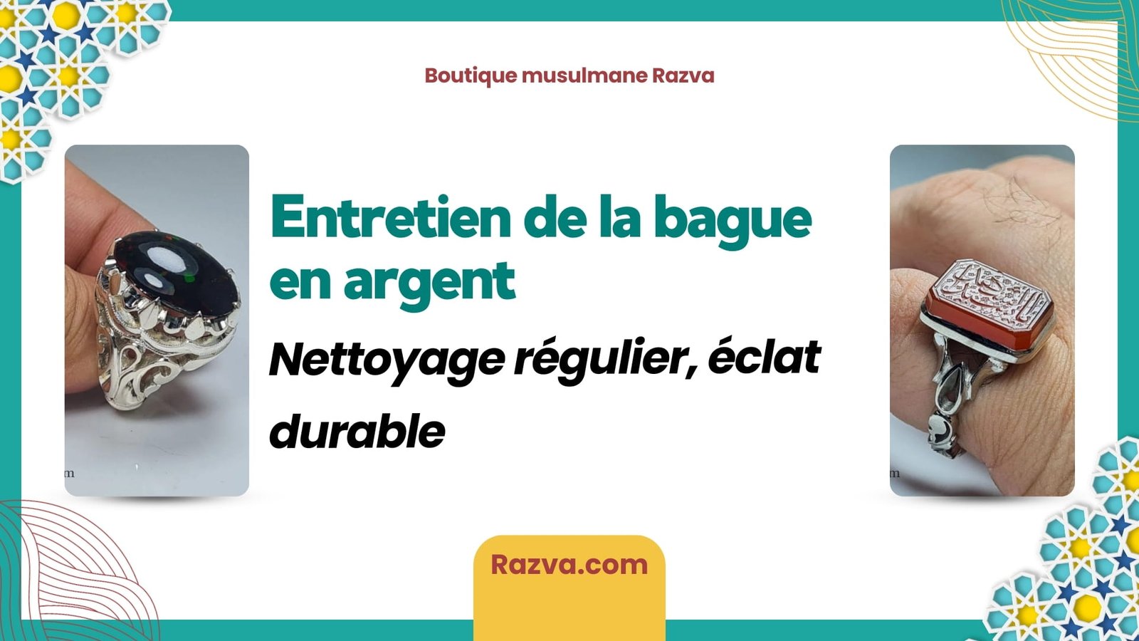 La boutique musulmane en ligne Razva propose des bagues en argent 925 soigneusement choisies, pour hommes et pour femmes, avec une attention particulière portée à la qualité, à l’esthétique et à la symbolique des bijoux.