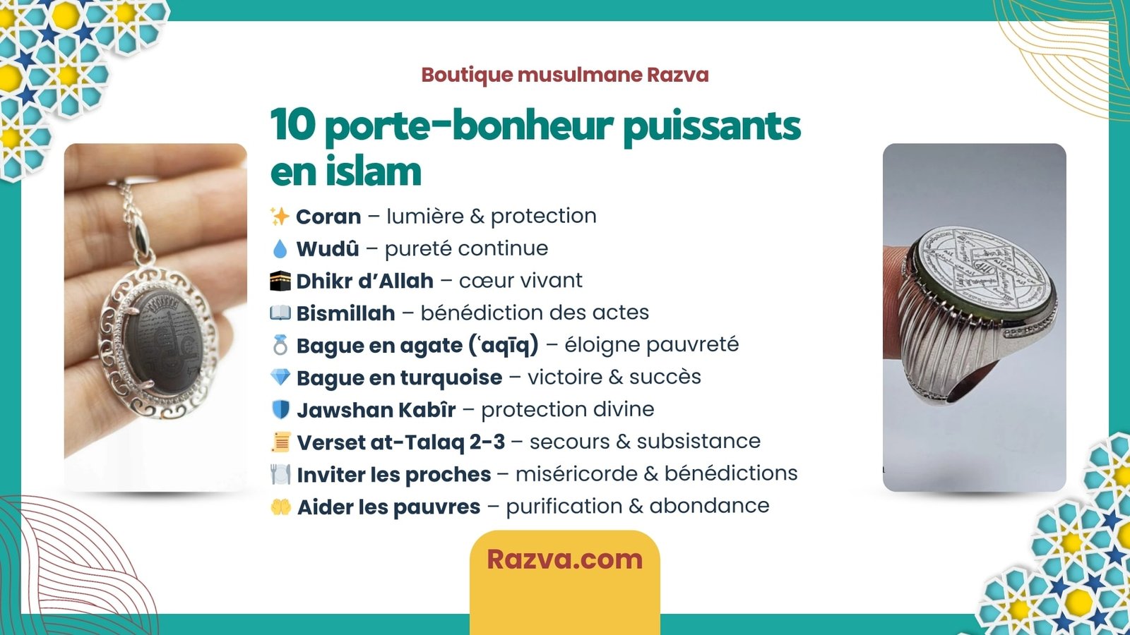 Comme nous l’avons vu, l’islam nous propose de véritables porte-bonheur : le Coran, les ablutions, le dhikr, Bismillah, les bagues en pierres précieuses, les invocations et les bonnes actions.
