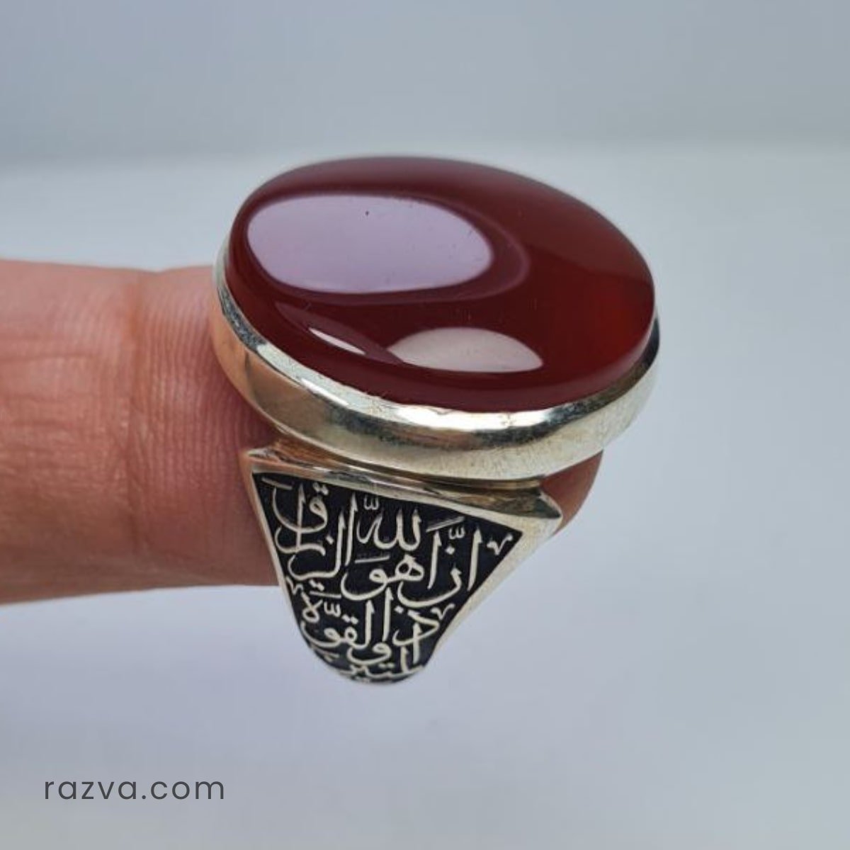 Voici une bague de caractère, pensée pour les amateurs de luxe discret et de symbolisme spirituel. Conçue à la main en Iran, cette bague en argent 925 massif présente une pierre naturelle d’agate rouge yéménite, taillée en ovale bombé et polie à la perfection.