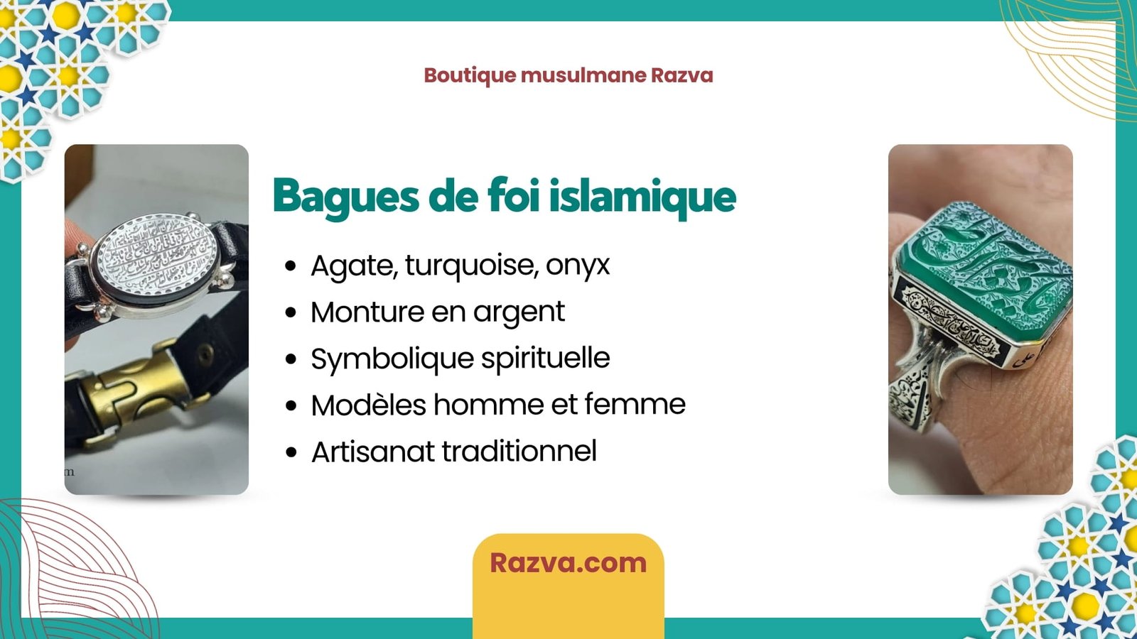 Les bagues islamiques occupent une place particulière dans la tradition musulmane. Plusieurs pierres précieuses et semi-précieuses sont conseillées et appréciées en islam pour leur symbolique spirituelle et leurs bienfaits, comme l’agate, la turquoise, le saphir, l’émeraude ou encore l’onyx.
