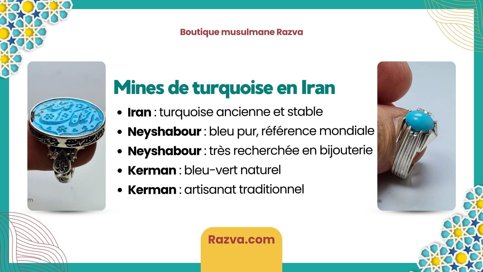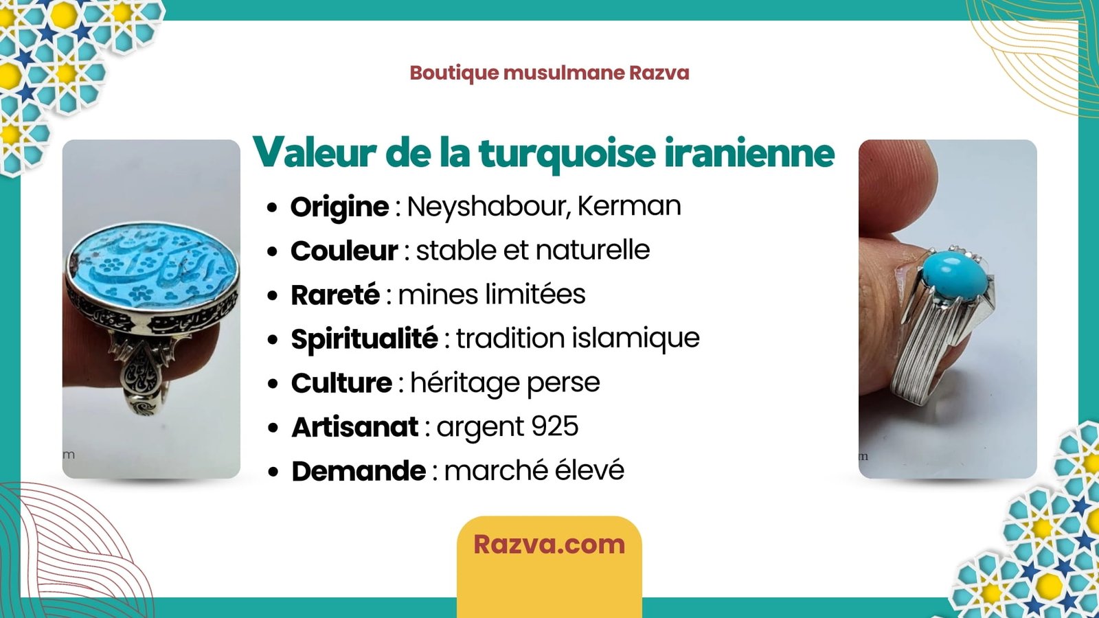 La boutique musulmane Razva travaille avec des artisans expérimentés et sélectionne chaque pierre avec rigueur afin de proposer des bijoux authentiques, durables et fidèles à la tradition iranienne.